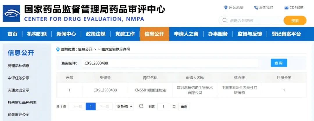 KN5501是恩瑞恺诺公司开发的一种基于CD19靶点的 CAR-NK 细胞治疗药物,旨在通过靶向CD19靶点实现CD19+B细胞的深度清除,诱导受试者自身免疫重建,达到疾病深度或完全缓解状态,使受试者脱离长期的激素和免疫抑制剂治疗。该药物采用独特的 HTAS-RV™递送系统和 CAR-NK 细胞扩增冻存技术,具有「通用化」和「现货型」的特点。此次获批的临床试验是一项开放、单臂、剂量递增的I期临床试验,旨在评估KN5501细胞注射液在复发难治性系统性红斑狼疮(SLE)受试者中的安全性、耐受性、药代动力学和有效性。目前,国内外尚未有同靶点CAR-NK细胞药物获批上市,KN5501的研发处于国际领先地位。